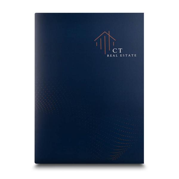 Die Taschen-Mappe-abgeschraegt- ist ein hochwertiges Produkt aus stabilem 360 g White Design Papier. Eine beidseitige kratzfeste Matt-Cellophanierung sorgt für eine angenehme, edle Haptik und schützt die Oberfläche zuverlässig vor Gebrauchsspuren. Im Inneren überzeugt die Mappe durch eine elegant abgeschrägte Tasche mit integriertem Visitenkartenschlitz, die ausreichend Platz für Unterlagen bietet. Die tief dunkelblaue Gestaltung wird auf der Innenseite durch den Slogan „Erfolg durch Expertise“ ergänzt.Diese Mappe eignet sich ideal für die professionelle Übergabe von Immobilienunterlagen, Exposés oder Investment-Angeboten. Sie unterstützt CT Real dabei, Inhalte hochwertig zu präsentieren und bereits beim ersten Kontakt Vertrauen zu schaffen. Als Hersteller legen wir großen Wert auf eine saubere Verarbeitung und eine hochwertige Anmutung, die den seriösen Markenauftritt von CT Real unterstreicht und bei jedem Kundentermin einen bleibenden Eindruck hinterlässt.