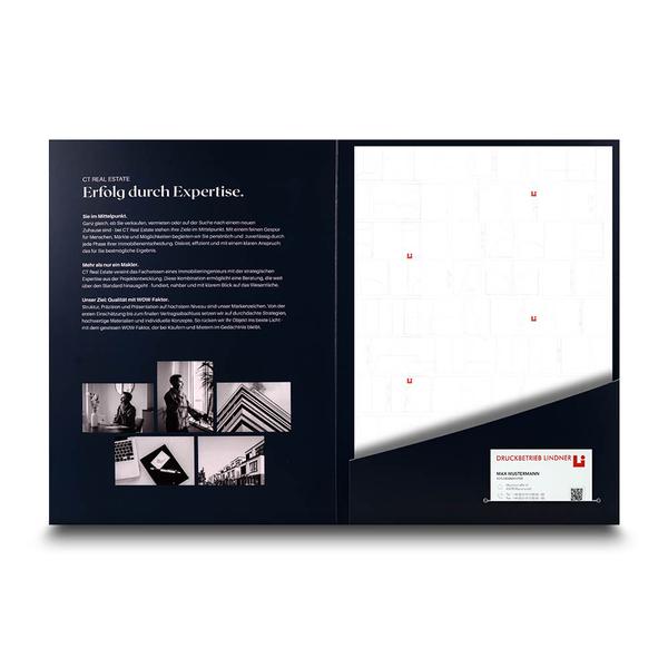 Die taschen-mappe-abgeschraegt- ist ein hochwertiges Produkt aus stabilem 360 g White Design Papier. Eine beidseitige kratzfeste Matt-Cellophanierung sorgt für eine angenehme, edle Haptik und schützt die Oberfläche zuverlässig vor Gebrauchsspuren. Im Inneren überzeugt die Mappe durch eine elegant abgeschrägte Tasche mit integriertem Visitenkartenschlitz, die ausreichend Platz für Unterlagen bietet. Die tief dunkelblaue Gestaltung wird auf der Innenseite durch den Slogan „Erfolg durch Expertise“ ergänzt.Diese Mappe eignet sich ideal für die professionelle Übergabe von Immobilienunterlagen, Exposés oder Investment-Angeboten. Sie unterstützt CT Real dabei, Inhalte hochwertig zu präsentieren und bereits beim ersten Kontakt Vertrauen zu schaffen. Als Hersteller legen wir großen Wert auf eine saubere Verarbeitung und eine hochwertige Anmutung, die den seriösen Markenauftritt von CT Real unterstreicht und bei jedem Kundentermin einen bleibenden Eindruck hinterlässt.