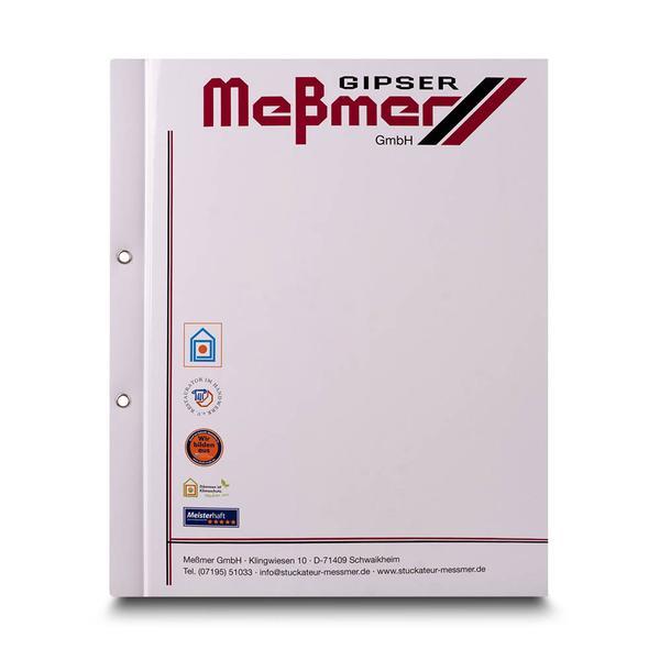 Die Angebotsmappe Messner ist ein professionelles und funktionales Produkt für Handwerksbetriebe wie Stuckateur Messmer. Diese sachlich gehaltene Schnellhefter-Mappe ist ideal für die Präsentation von Angeboten und Dokumenten. Sie ist mit einer glänzenden Cellophanierung veredelt und trägt den Betriebsnamen groß auf der Vorderseite. Innen verfügt die Mappe über eine praktische Schnellheftermechanik, was eine geordnete und sichere Ablage von Dokumenten ermöglicht. Diese hochwertige Mappe hilft Stuckateur Messmer, bei potenziellen Kunden einen bleibenden und kompetenten Eindruck zu hinterlassen. Ihre durchdachte Funktionalität und das ansprechende Design spiegeln den Qualitätsanspruch und die Seriosität des Unternehmens wider. Sie ermöglicht eine effiziente und repräsentative Übergabe von Informationen an Kunden und Partner und stärkt so die Kundenbindung im Bau- und Handwerksbereich.