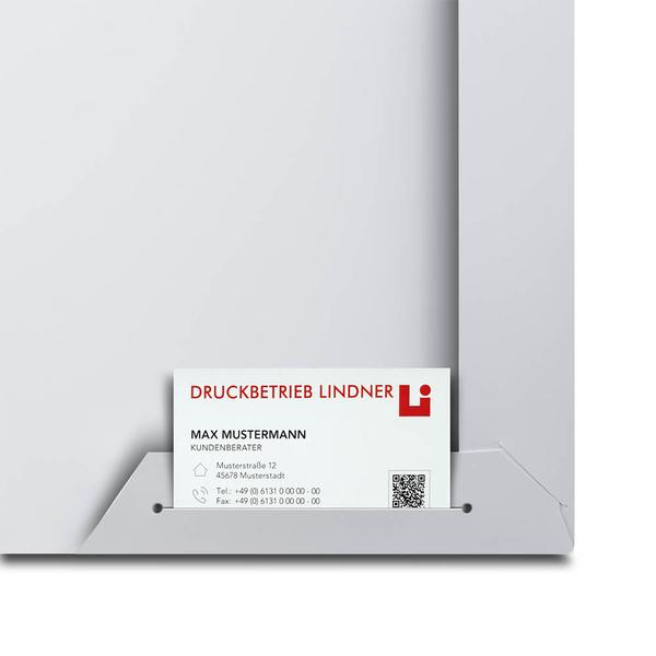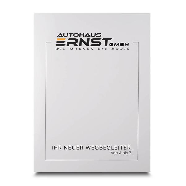Die Autohausmappe Wegbeleiter besteht aus stabilem 360g White Design Karton mit beidseitigem Li-Brillantlack matt und vermittelt sofort eine hochwertige Haptik. Auf der rechten Innenseite halten eine seitliche Lasche und eine gesteckte untere Lasche Unterlagen sicher zusammen, zusätzlich befindet sich ein gerader Visitenkartenschlitz direkt auf der Lasche für persönliche Kontaktdaten. Die Titelseite trägt Logo und den Hinweis „Ihr neuer Wegbeleiter von A bis Z“ und bündelt alle Informationen rund um Fahrzeug, Service und Beratung übersichtlich. Als Hersteller unterstützen wir das Autohaus Ernst GmbH dabei, Kundenunterlagen strukturiert zu übergeben und den Fahrzeugkauf mit einem professionellen Markenauftritt zu begleiten.