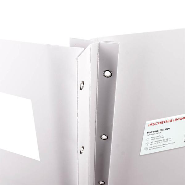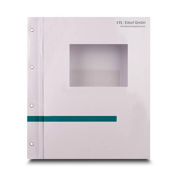Die Bilanzmappe ist aus erstklassigem Qualitäts-Mappen-Karton gefertigt und überzeugt durch ihre funktionale Architektur mit insgesamt 16 strategisch platzierten Metallösen. Eine präzise Fensterstanzung auf der Vorderseite gibt den Blick auf das Deckblatt frei, während das schlichte Design mit Firmennamen und blauem Farbbalken Professionalität ausstrahlt. Dank der speziellen Metallösen für Mappenabheftung lassen sich die Dokumente sicher in Ordnern archivieren oder durch die acht mittigen Ösen direkt in der Mappe fixieren. Wir vom Mappenhaus unterstützen die Steuerberatungsgesellschaft Eitorf dabei, ihre anspruchsvollen Leistungen in der Finanz- und Steuerbranche haptisch perfekt zu unterstreichen. Diese Bilanzmappe dient als hochwertiger Rahmen für Jahresabschlüsse und wichtige Verträge, wobei die integrierte Visitenkartentasche den direkten Kontakt zum Mandanten sichert. Als Hersteller garantieren wir eine hochwertige Marken-Präsentation, die Seriosität vermittelt und die Fachkompetenz der Kanzlei bei jedem Mandantentermin wirkungsvoll hervorhebt.