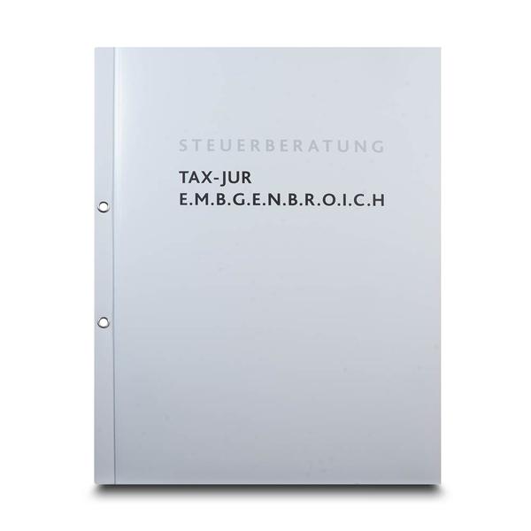 Die Bilanzmappe Steuerberatung besticht durch ihren hochwertigen 300g White Design Karton und das schlichte Design, das durch einen matten Brillantlack sowie funktionale Details wie die Schnellheftermechanik und silberne Abheftösen für eine perfekte Organisation sorgt. Mit der integrierten linken Tasche inklusive Visitenkartenschlitz bietet dieses System der Kanzlei TAX JUR Fohr Embgenbroich den idealen Rahmen, um Mandanten ihre Bilanzen und steuerlichen Auswertungen in der Branche der Steuerberatung hochprofessionell zu überreichen. Der Kunde erreicht mit dieser klaren Struktur eine erstklassige Repräsentation seiner fachlichen Seriösität und stärkt das Vertrauen seiner Mandanten durch eine geordnete Dokumentenübergabe direkt beim Beratungstermin. Wir von Mappenhaus unterstützen als spezialisierter Hersteller dabei, diese juristische Kompetenz und den Markenkern in einem starken Markenauftritt perfekt sichtbar zu machen.