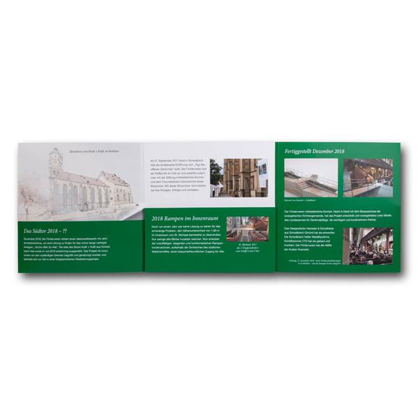 Die quadratische Fördervereins-Mappe Mittelalterlicher Kirchen in Schwäbisch Hall ist beidseitig bedruckt. Die Mappe hat auf der Innenseite eine Einstecktasche, die mit und ohne Schlitze gestanzt werden kann.