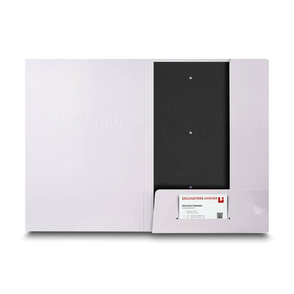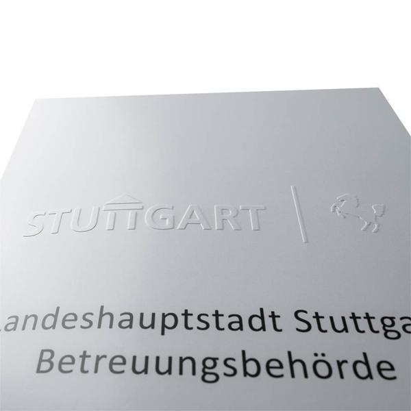 Die Infomappe Landeshauptstadt Stuttgart besticht durch zwei edle Farbvarianten in Schwarz und Weiß, die durch eine markante Hochprägung des Stadtwappens auf FSC-zertifiziertem 300g White Design Karton eine exklusive Haptik erhalten. Im Inneren ist die Mappe mit einem funktionalen System aus zwei Laschen und einem praktischen Visitenkartenschlitz ausgestattet. Dank der variablen Steghöhen und des matten Brillantlacks bietet die Mappe der Landeshauptstadt Stuttgart einen flexiblen und hochwertigen Rahmen für die Unterlagen der Betreuungsbehörde. Die Stadtverwaltung setzt dieses System ein, um Bürgern wichtige Informationen strukturiert zu überreichen und die behördliche Kompetenz seriös zu vermitteln. Damit erreicht die Behörde eine vertrauensvolle Kommunikation und hinterlässt bei den Empfängern einen bleibenden, geordneten Eindruck ihrer Dienstleistungen. Wir von Mappenhaus unterstützen unseren Kunden als Hersteller dabei, diese institutionelle Verantwortung in einem starken Markenauftritt perfekt zu präsentieren.