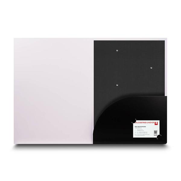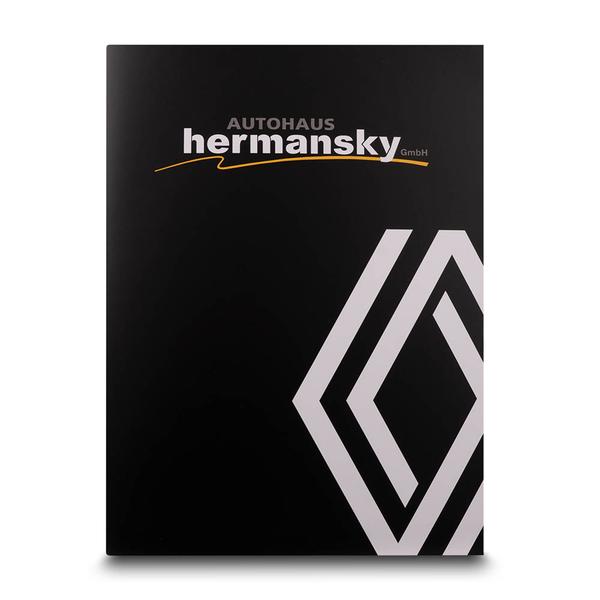 Die Mappe ist ein professionelles und funktionales Produkt für Autohäuser wie das Autohaus Hermansky. Die Rundtaschen-Mappe ist außen mit dem Autohaus-Namen und Logo bedruckt. Sie ist mit matter, kratzfester Cellophanierung veredelt, was ihr eine luxuriöse Haptik verleiht. Innen verfügt die Mappe über eine große, abgerundete schwarze Tasche und einen Visitenkartenschlitz, was eine geordnete Präsentation von Dokumenten ermöglicht. Diese hochwertige Mappe hilft dem Autohaus Hermansky, bei Kunden einen bleibenden und kompetenten Eindruck zu hinterlassen. Ihre durchdachte Funktionalität und das ansprechende Design spiegeln den Qualitätsanspruch und die Seriosität des Unternehmens wider. Sie ermöglicht eine effiziente und repräsentative Übergabe von Informationen an Kunden und Partner und stärkt so die Kundenbindung im Automobilbereich.