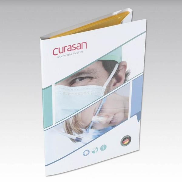 Die Mappe Biochirurgie ist ein professionelles Informationsinstrument für die Medizin-Branche, wie das Beispiel von curasan zeigt. Diese Spitzlaschen-Mappe ist für Fachpersonal konzipiert. Die Vorderseite zeigt eine emotionale Bildcollage aus einem Arzt in Nahaufnahme und einem kleinen Jungen, was die Menschlichkeit der Biochirurgie unterstreicht. Die Innen- und Außenseiten sind schlicht weiß, mit dem curasan Logo und Kontaktdaten. Innen links findet sich ein strukturierter Überblick über das Produktportfolio mit Symbolen zur schnellen Orientierung. Diese hochwertige Mappe hilft curasan, die Markenbotschaft emotional und professionell zu präsentieren. Die durchdachte Funktionalität mit zwei Spitzlaschen und einem Visitenkartenschlitz spiegelt den Qualitätsanspruch des Unternehmens wider. Sie ermöglicht eine effiziente und ansprechende Übergabe wichtiger Informationen und stärkt so die Kundenbindung im Medizinbereich.