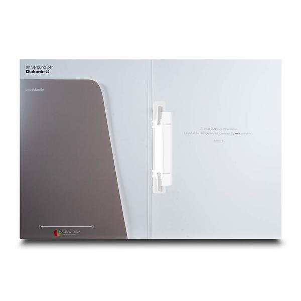 Die Mappe Diakonie Haus Widum ist aus 360 g White Design gefertigt, einseitig matt cellophaniert und beidseitig mit mattem Brillantlack veredelt. Die Titelseite trägt mittig das Logo sowie den Schriftzug „haus widum – freude am leben“ auf einem individuell gestalteten grauen Hintergrund und vermittelt Ruhe sowie Wertigkeit. Innen befindet sich eine graue Tasche (188 x 265 mm) mit Visitenkartenschlitz, sowie eine praktische Abheftvorrichtung für zusätzliche Unterlagen – sowohl innen als auch außen. So entstehen klare Struktur, sichere Ablage und ein stimmiger Gesamtauftritt. Die „Haus Widum“ gemeinnützige GmbH nutzt diese Mappe im sozialen und diakonischen Bereich, um Informationsmaterial, Konzepte und persönliche Unterlagen geordnet zu überreichen. Der wertige Eindruck stärkt Vertrauen bei Angehörigen, Partnern und Interessierten. Als Hersteller unterstützen wir dabei, soziale Kompetenz und gelebte Werte in einem starken Markenauftritt professionell sichtbar zu machen.