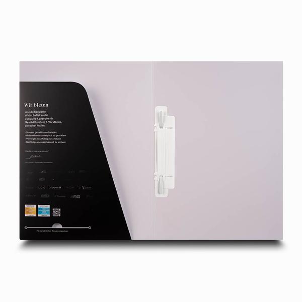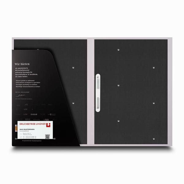 Die Mappe Finanzberatung ist eine haptisch beeindruckende Präsentationslösung, die durch eine einseitige kratzfeste Matt-Cellophanierung und edlen Brillantlack optimal vor Abnutzung geschützt ist. Ausgestattet mit einer innovativen Abheftvorrichtung für innen und außen sowie einer stabilen schwarzen Innentasche mit extra breitem Visitenkartenschlitz, bietet sie perfekte Organisation für anspruchsvolle Dokumente. Das Außendesign unterstreicht mit dem prägnanten Logo und dem Schriftzug „Exklusive Wirtschaftslösungen“ den hohen Qualitätsanspruch, während die Innentasche die spezifischen Tätigkeitsfelder der Kanzlei übersichtlich präsentiert.