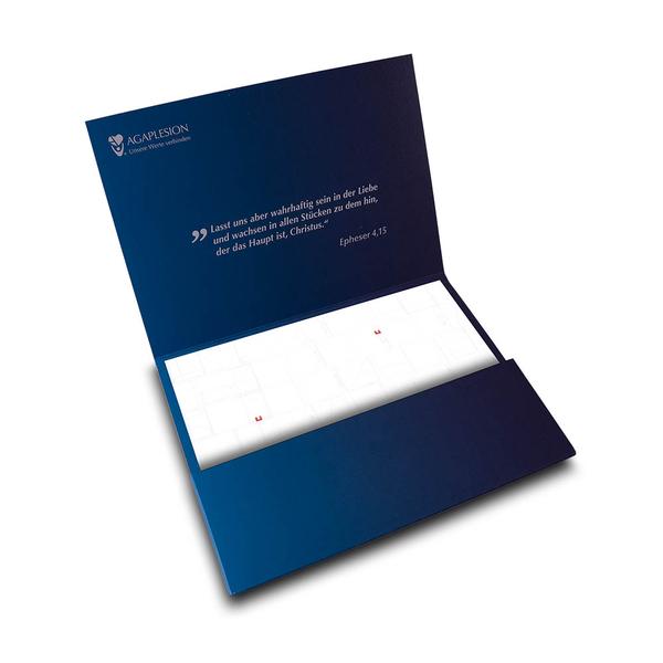 Die Mappe Führungskräftekonferenz ist eine hochwertig produzierte A5-Einschub-Taschenmappe aus 300 g Natureline Basic Papier, die sich quer öffnet und eine klare, strukturierte Nutzung ermöglicht. Im Inneren sorgt eine breite Tasche mit 7 mm Steghöhe und Doppel-Nut-Steg für die sichere Aufnahme von Konferenzunterlagen, ganz bewusst ohne Visitenkartenschlitz. Das reduzierte Design zeigt auf der Vorderseite das Logo von AGAPLESION, ergänzt durch ein Zitat im oberen inneren Bereich sowie den prägnanten Slogan „Gewalt hat bei uns keinen Platz“ im unteren Innenteil. Wir vom Mappenhaus unterstützen AGAPLESION dabei, ihre Werte, Führungskompetenz und Verantwortung in der Gesundheitsbranche sichtbar zu vermitteln. Die Mappe dient dazu, die Führungskräftekonferenz 2025 professionell zu begleiten und den Markenkern – Menschlichkeit, Klarheit und Verantwortung – bei den Teilnehmenden nachhaltig zu verankern.