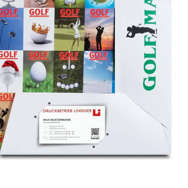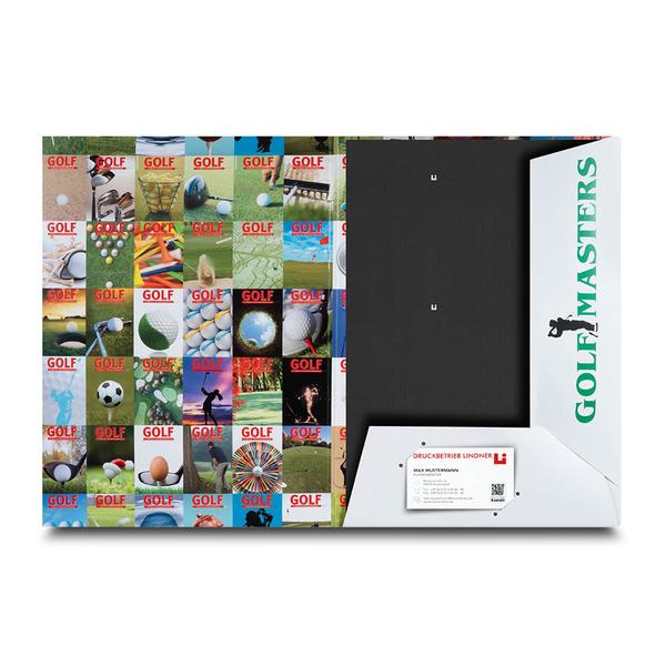 Die Mappe Golf-Masters wird aus 360 g White Design gefertigt und beidseitig mit mattem Brillantlack veredelt, was ihr eine hochwertige Haptik und Stabilität verleiht. Die Titelseite zeigt eine Golfspielerin mit dem Titel „GOLF“ sowie dem Logo und vermittelt sofort sportliche Eleganz. Innen sorgen ein 6 mm Mittelsteg, gesteckte Laschen mit 6 mm Steghöhe und ein diagonal gesetzter Visitenkartenschlitz für eine strukturierte Ablage von Turnier- oder Informationsunterlagen. Die linke Innenseite ist mit zahlreichen kleinen Golfball-Motiven gestaltet und unterstreicht das thematische Gesamtbild. Golf-Masters nutzt diese Mappe im Sport- und Eventbereich, um Veranstaltungen, Turniere und Angebote professionell zu präsentieren. Die klare Struktur unterstützt eine geordnete Übergabe von Informationen und stärkt die Markenpräsenz in Berlin und Brandenburg. Als Hersteller unterstützen wir dabei, sportliche Qualität und Organisation in einem starken Markenauftritt hochwertig sichtbar zu machen.