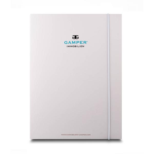 Die Mappe für Immobilien Gamper ist ein Ausdruck höchster Exklusivität und Detailverliebtheit, perfekt für die Präsentation anspruchsvoller Immobilien. Veredelt mit einer Rosegold-Heißfolie, kommt das Logo auf dieser Mappe außergewöhnlich elegant zur Geltung und unterstreicht die Wertigkeit jedes Angebots. Der verwendete Karton besticht durch seine besondere natürliche Haptik, die ein angenehmes Berührungserlebnis schafft. Diese Dreilaschenmappe, sicher verschlossen mit einem stilvollen weißen Gummizug, hält alle wichtigen Unterlagen zu Gewerbe- und Investmentimmobilien geordnet bereit. Immobilien Gamper, bekannt für seine exklusiven Objekte und kundenorientierte Beratung, nutzt diese Mappe, um ihren Kunden Exposés und Angebote auf eine Weise zu überreichen, die Vertrauen schafft und den hohen Qualitätsanspruch des Unternehmens widerspiegelt. Wir als Ihre Druckerei sind Spezialisten für Präsentationsmappen, die besonders sind und Marken-Botschaften hochwertig präsentieren. Wir unterstützen Immobilien Gamper dabei, ihre Positionierung im Premiumsegment durch einzigartige Druckprodukte zu festigen.