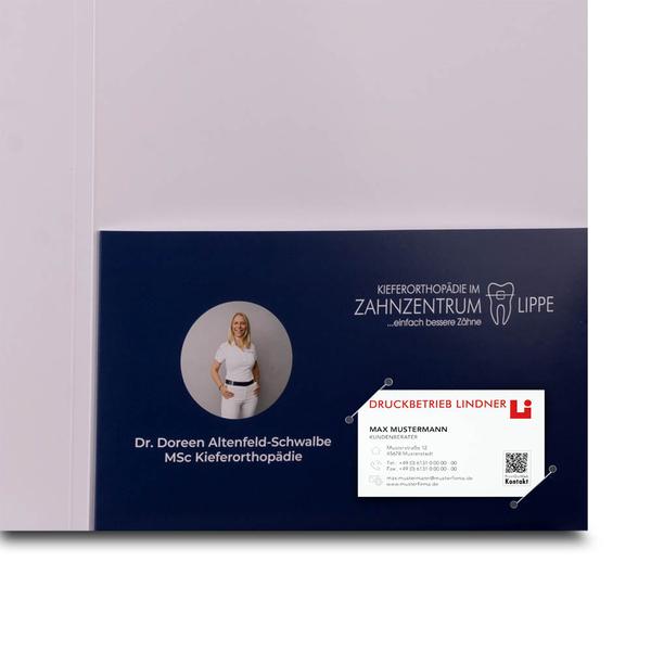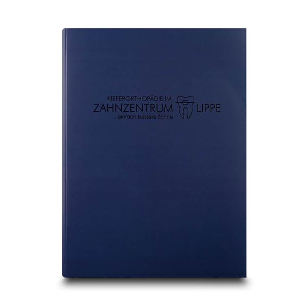 Die Kieferorthopädie- Mappe besticht durch ihren hochwertigen 360g White Design Karton und das edle Dunkelblau, das durch einen einseitig matten Brillantlack sowie einen fühlbaren Relief Lack exzellent veredelt ist. Diese durchdachte 6-Seiten-Mappe bietet mit einer individuell bedruckten Tasche inklusive Visitenkartenschlitz und der integrierten weißen Abheftvorrichtung den idealen Raum für alle Patientenunterlagen. In der modernen Kieferorthopädie nutzt das Kieferorthopädie Zahnzentrum Lippe dieses Ordnungssystem, um Behandlungspläne strukturiert zu übergeben und den Patienten von Beginn an die Kompetenz hinter dem Slogan „einfach bessere Zähne“ spürbar zu machen. Die Praxis erreicht dadurch eine professionelle Patientenbindung und sorgt dafür, dass alle medizinischen Dokumente sicher sowie repräsentativ gebündelt bleiben. Wir unterstützen als spezialisierter Hersteller dabei, diese hohen Qualitätsstandards und den Kern der Marke in einem starken Markenauftritt perfekt zu präsentieren.