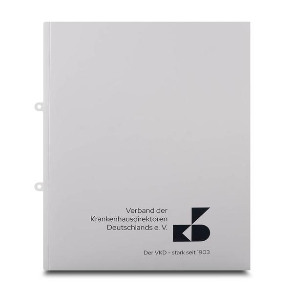 Die Mappe Krankenhausdirektoren ist das ideale Medium für eine hochwertige Dokumentation und Kommunikation im Management von Gesundheitseinrichtungen. Ihre Außenseite ist elegant schwarz bedruckt, was sofort Professionalität und Autorität signalisiert. Im Innenteil befindet sich links eine praktische Tasche mit eingestanztem Visitenkartenschlitz, die den direkten Kontakt erleichtert. Zusätzlich sorgt eine integrierte Innen- und Außenabheftung im Bund für die sichere und übersichtliche Ablage umfangreicher strategischer Unterlagen. Der Verband der Krankenhausdirektoren Deutschlands (VKD e.V.), eine führende Instanz im Gesundheitswesen, nutzt diese Mappe, um ihre Mitglieder und Partner mit essentiellen Informationen und Studien zu versorgen. Wir als Ihre Druckerei sind Spezialisten für Präsentationsmappen, die besonders sind und Marken-Botschaften hochwertig präsentieren. Wir unterstützen den VKD dabei, die Zukunft des Gesundheitswesens durch exzellente Kommunikation mitzugestalten.