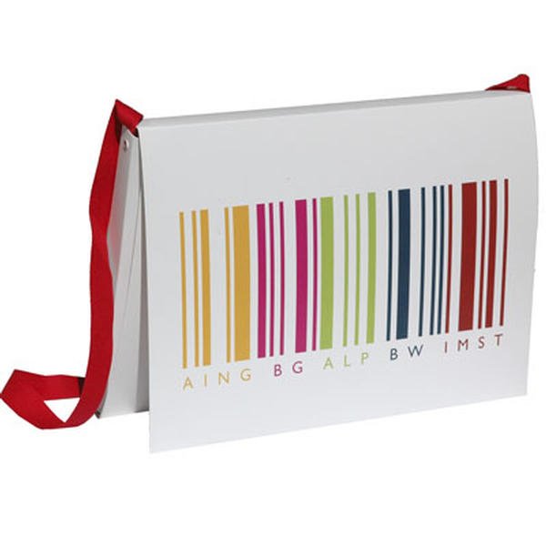 Mappe mit breitem Rücken und Umhängeband: der ideale Messebegleiter. Eine praktische Mappe, die sich Ihre Kunden lässig über die Schulter hängen können. Der Tragegurt an der Mappe ist mit Nieten befestigt. Die Mappe ist Tasche und edle Mappe in einer Funktion.