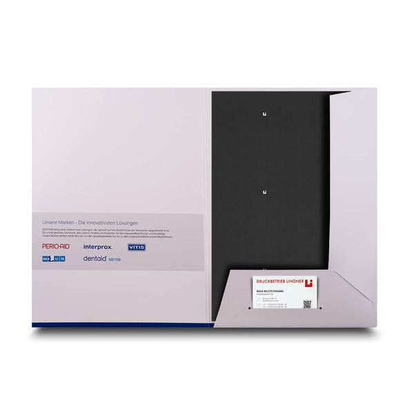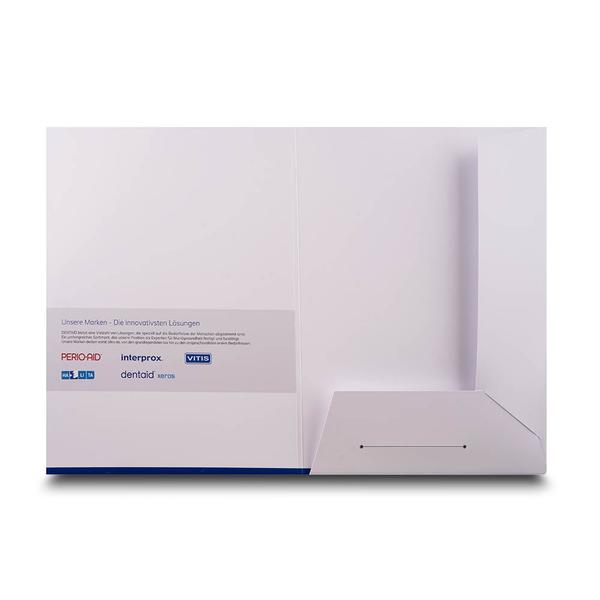 Die Top-Standard-Mappe DENTAID ist eine hochwertige Präsentationsmappe, die durch eine beidseitige Veredelung mit Li-Brillantlack matt eine besonders angenehme Haptik und eine edle Optik erhält. Die Vorderseite im Corporate Design zeigt verschiedene Produkte für die Zahngesundheit und transportiert mit dem Slogan „Ihre Mundgesundheit ist uns wichtig“ die zentrale Botschaft der Marke. Im Inneren sorgen zwei gesteckte Laschen mit 4 mm Steghöhe sowie ein integrierter Visitenkartenschlitz für eine strukturierte und sichere Ablage von Informationsmaterial. Wir vom Mappenhaus unterstützen DENTAID dabei, ihre Kompetenz in der Mundhygiene professionell zu präsentieren und Fachkreisen sowie Patienten Unterlagen übersichtlich zu übergeben. Die Mappe stärkt den Markenkern als forschungsorientierter Spezialist für Zahn- und Mundpflege und hinterlässt einen klaren, vertrauenswürdigen Eindruck bei Zahnärzten und Apotheken.