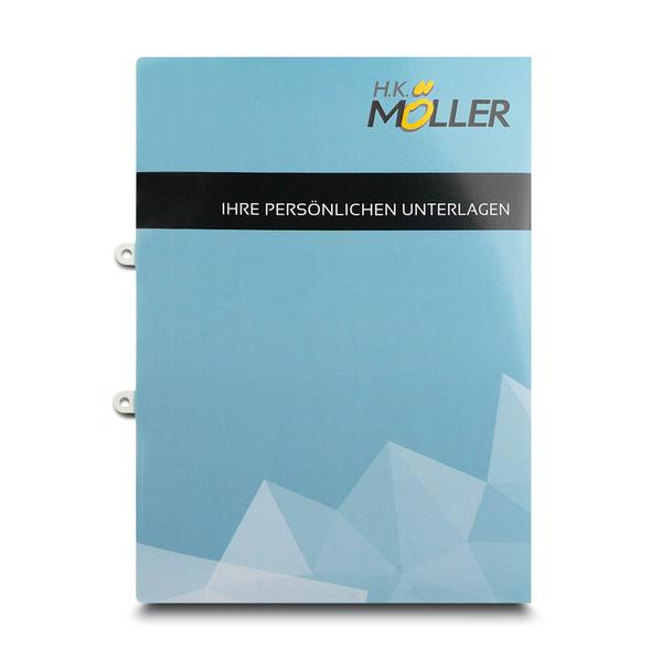 Die Mappe persönliche Unterlagen ist ein professionelles und vielseitiges Produkt für Unternehmen wie H&K Möller. Das hellblaue Design mit dem Logo und der Beschriftung "Ihre persönlichen Unterlagen" in einem schwarzen Balken vermittelt einen professionellen Eindruck. Die Mappe verfügt über eine linke, geklebte Tasche mit einem Visitenkartenschlitz und eine Abheftvorrichtung für innen und zum rausschieben für außen, was eine geordnete und flexible Ablage von Dokumenten ermöglicht. Diese hochwertige Mappe hilft H&K Möller, ihre Markenbotschaft professionell und kompetent zu kommunizieren. Ihre durchdachte Funktionalität und das ansprechende Design spiegeln den Qualitätsanspruch und die Seriosität des Unternehmens wider. Sie ermöglicht eine effiziente und repräsentative Übergabe von Informationen an Kunden und Partner und stärkt so die Kundenbindung im Bau- und Dachbereich.