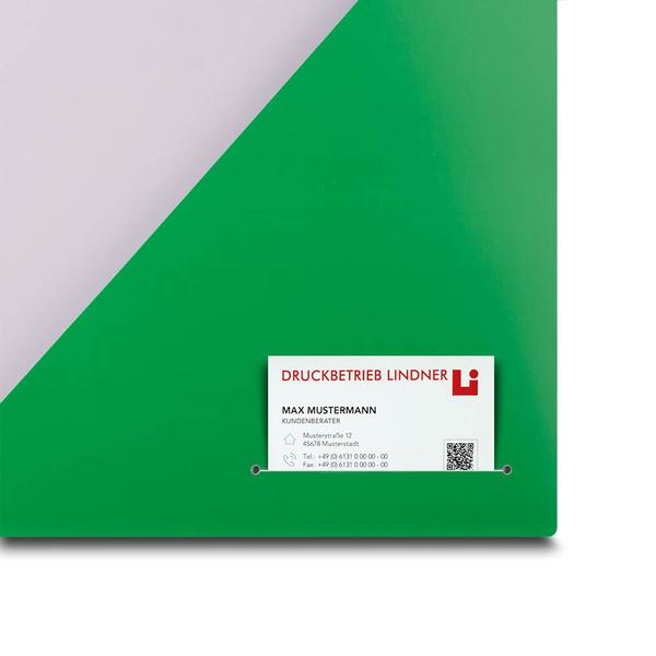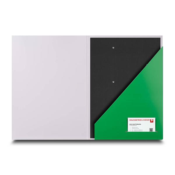 Die Mappe Personaldienstleistung ist eine hochwertige Präsentationsmappe aus 360g White Design mit auffälligem grünem Pantone-Innenleben und matter Relief-Lackierung, die Unterlagen strukturiert und farblich ansprechend bündelt. Innen haltet eine schräg gesteckte Einstecktasche und ein praktischer Visitenkartenschlitz Dokumente sicher, während die gestalterischen Details und die hochwertige Lackierung (u. a. Relief Lack) den professionellen Eindruck verstärken. Das glänzende Logo auf der Titelseite hebt die Marke hervor und macht die Mappe im Kundengespräch sofort wiedererkennbar. Als Hersteller unterstützen wir Personaldienstleister dabei, Dienstleistungen kompakt zu präsentieren, Vertrauen zu schaffen und Kandidat:innen sowie Auftraggeber:innen wirkungsvoll anzusprechen.