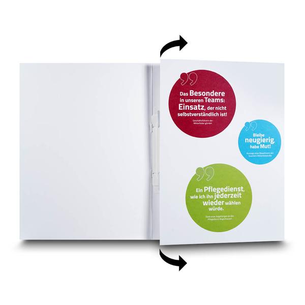 Die Mappe Pflegen Bilden Begleiten ist eine 6-seitige Präsentationsmappe aus 350g Natureline Premium und verbindet Stabilität mit einer hochwertigen, natürlichen Anmutung. Die Titelseite trägt das individuelle Design mit Logo und dem Leitmotiv „Wir pflegen Lebensfreude“ und schafft sofort Vertrauen. Innen befindet sich mittig eine praktische Abheftvorrichtung zum Einlegen oder Herausschieben, ergänzt durch eine rechte Tasche mit diagonalem Visitenkartenschlitz. So bleiben Informationsunterlagen, Konzepte und Kontaktdaten übersichtlich und griffbereit. Die Mitterfelder nutzen diese Mappe, um Leistungen im Pflege- und Bildungsbereich strukturiert und wertschätzend zu präsentieren. Als Hersteller unterstützen wir dabei, diese Markenbotschaft hochwertig zu transportieren und professionell zu inszenieren.