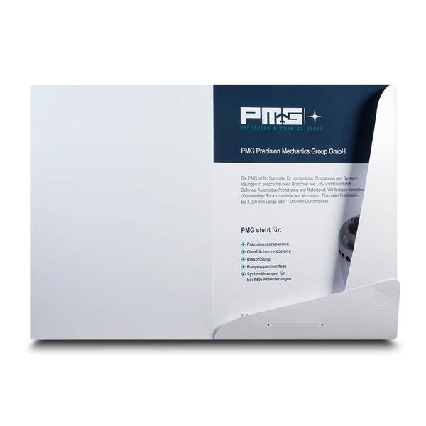 Die Mappe PMG Precision Mechanics besticht durch ihren hochwertigen 300g White Design Karton, der durch einen beidseitig matten Brillantlack eine exzellente Haptik und ein professionelles Finish erhält. Mit ihren präzisen gesteckten Laschen und dem vertikalen Visitenkartenschlitz bietet sie den idealen Rahmen für die strukturierte Übergabe technischer Dokumentationen. Die PMG Precision Mechanics Group GmbH nutzt diese Mappe in der Branche der Präzisionsmechanik, um ihr Leistungsversprechen „ANDRE REDEN. WIR MACHEN!“ direkt greifbar zu vermitteln. Das Unternehmen erreicht mit diesem funktionalen Werbemittel eine erstklassige Repräsentation seiner technischen Kompetenz und stärkt die Bindung zu seinen Geschäftspartnern durch eine geordnete Unterlagenführung. Wir von Mappenhaus unterstützen als spezialisierter Hersteller dabei, diese handwerkliche Präzision und den Markenkern in einem starken Markenauftritt perfekt zu präsentieren.