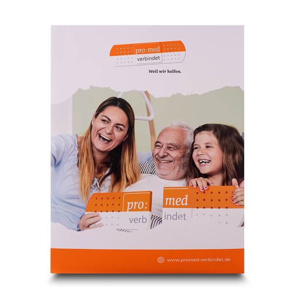 Die Doppeltaschen Mappe ist ein professionelles und emotional ansprechendes Produkt für Sanitätshäuser und Pflegedienste wie pro med. Die Vorderseite ist mit einem Foto bedruckt, das lachende Familienmitglieder zeigt und damit die menschliche Komponente des Pflegeservice unterstreicht. Die Mappe verfügt über zwei schräge Innentaschen in Orange, die eine geordnete Präsentation von Dokumenten ermöglichen. Ein diagonaler Visitenkartenschlitz und ein QR-Code innen rechts runden die Funktionalität ab. Diese hochwertige Mappe hilft pro med, ihre Markenbotschaft professionell und kompetent zu kommunizieren. Ihre durchdachte Funktionalität und das ansprechende Design spiegeln den Qualitätsanspruch und die Seriosität des Unternehmens wider. Sie ermöglicht eine effiziente und repräsentative Übergabe von Informationen an Klienten und Partner und stärkt so die Kundenbindung im Gesundheitswesen.