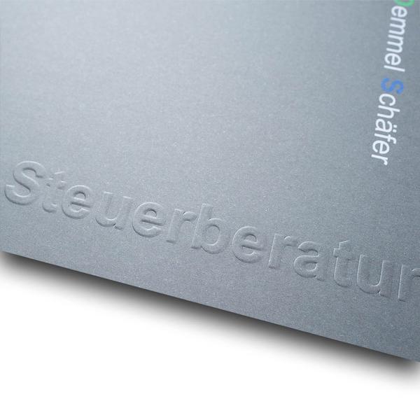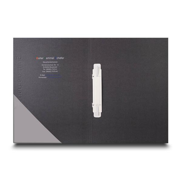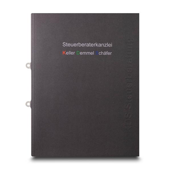 Die Mappe Steuerberaterkanzlei beeindruckt durch ihr edles 350g Natureline Premium Papier in Dunkelgrau, welches durch eine hochwertige Hochprägung am Rand eine exklusive haptische Note erhält. Im Innenteil ermöglicht die praktische, weiße Abheftvorrichtung zum Herausschieben eine flexible Dokumentenverwaltung, während die transparente Dreiecktasche und die aufgedruckten Kontaktdaten für perfekte Übersicht sorgen. Die Kanzlei Keller Demmel Schäfer nutzt diese professionelle Mappe, um ihren Mandanten eine strukturierte Ordnung ihrer Steuerunterlagen zu bieten und gleichzeitig ihre fachliche Kompetenz zu unterstreichen. Wir von Mappenhaus unterstützen als Hersteller dabei, die Seriosität und den Markenkern der Kanzlei in einem starken Markenauftritt sichtbar zu machen.