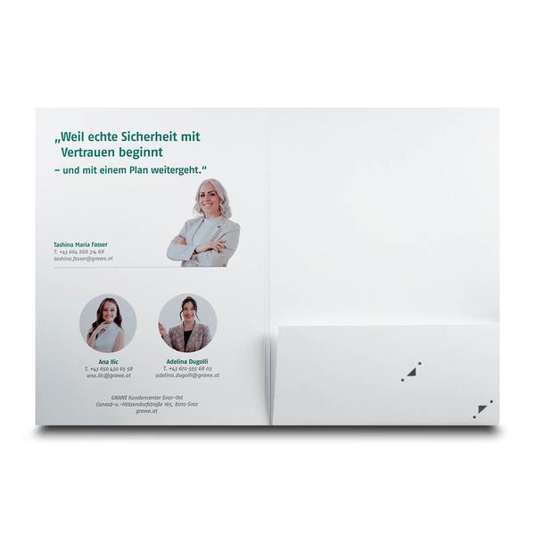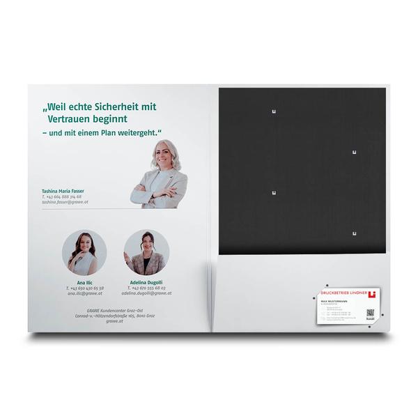 Die Mappe Versicherung ist eine hochwertige Präsentationsmappe aus 300 g White Design. Die Titelseite zeigt ein professionelles Mitarbeitermotiv mit Logo und vermittelt Kompetenz auf den ersten Blick. Innen links sind Ansprechpartner mit Porträt und Kontaktdaten platziert, ergänzt durch die Botschaft „weil echte Sicherheit mit Vertrauen beginnt und mit einem Plan weitergeht“. Ein 5 mm Mittelsteg sowie eine rechte Tasche mit diagonalem Visitenkartenschlitz sorgen für strukturierte Ablage und eine persönliche Übergabe. Die grawe versicherung nutzt diese Mappe in der Versicherungsbranche, um Beratungsunterlagen, Angebote und Vertragsinformationen übersichtlich zu präsentieren. Der klare Aufbau stärkt Vertrauen und unterstreicht die persönliche Betreuung durch feste Ansprechpartner. Als Hersteller unterstützen wir dabei, Beratungsqualität und Service in einem starken Markenauftritt hochwertig sichtbar zu machen.