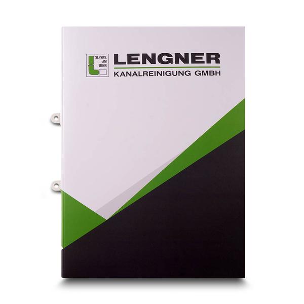 Die Mappe Wassertechnik Lengner ist ein professionelles und funktionales Produkt für Fachbetriebe wie die Lengner Kanaltechnik GmbH. Die Vorderseite ist mit einem passenden Layout und dem Firmennamen bedruckt. Die Mappe verfügt über eine Innenabheftvorrichtung und zwei gesteckte Laschen auf der rechten Seite, die eine geordnete Präsentation von Dokumenten ermöglichen. Ein Visitenkartenschlitz auf der unteren Lasche sorgt für eine professionelle Präsentation von Kontaktdaten. Eine Li-Brillantlack matt Veredelung verleiht der Mappe eine hochwertige Haptik. Diese hochwertige Mappe hilft der Lengner Kanaltechnik GmbH, bei Kunden einen bleibenden und kompetenten Eindruck zu hinterlassen. Ihre durchdachte Funktionalität und das ansprechende Design spiegeln den Qualitätsanspruch und die Seriosität des Unternehmens wider. Sie ermöglicht eine effiziente und repräsentative Übergabe von Informationen an Kunden und Partner und stärkt so die Kundenbindung in der Wasser- und Kanaltechnik.