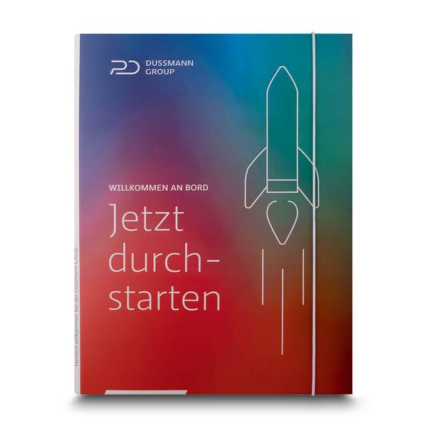 Die Dussmann Group ist ein globaler Anbieter für integrierte Dienstleistungen und legt großen Wert darauf, neue Mitarbeiter zu motivieren und zu begeistern. Um diesen Anspruch zu unterstreichen, haben wir die Onboarding Mappe Dussmann gestaltet. Mit ihrem auffälligen einseitigen Druck und einer Rakete auf dem Titel, signalisiert die Mappe sofort Aufbruch und Dynamik. Der begleitende Slogan - Jetzt durchstarten - verstärkt diese Botschaft und lädt neue Mitarbeiter aktiv dazu ein, ihre Karriere bei Dussmann zu beginnen. Für einen sicheren Verschluss der Unterlagen in der Mappe sorgt der praktische weiße Gummizug. Als Ihr Partner für hochwertige Präsentationsmappen sind wir stolz, die Markenbotschaft der Dussmann Group auf diese kreative und ansprechende Weise zu unterstützen.