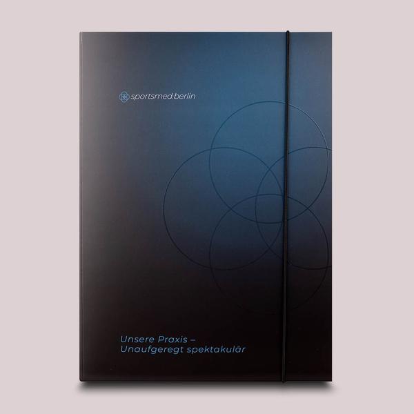 Die OP Mappe Sportsmedizin ist ein professionelles und elegantes Produkt für Kliniken wie sportsmed.berlin. Die Spitzlaschen-Mappe besticht durch ihr modernes, dunkles Design mit feinen, glänzenden Kreislinien und einem dezenten Logo. Ein schwarzer Gummizugverschluss sichert die Unterlagen. Die Mappe hat zwei gesteckte, schwarze Spitzlaschen auf der rechten Seite, die eine geordnete Präsentation von Dokumenten ermöglichen. Eine kratzfeste, matte Cellophanierung und partieller Relieflack verleihen der Mappe eine luxuriöse Haptik. Diese hochwertige Mappe hilft sportsmed.berlin, bei Kunden einen bleibenden und kompetenten Eindruck zu hinterlassen. Ihre durchdachte Funktionalität und das ansprechende Design spiegeln den Qualitätsanspruch und die Seriosität des Unternehmens wider. Sie ermöglicht eine effiziente und repräsentative Übergabe von Informationen an Kunden und Partner und stärkt so die Kundenbindung im Gesundheitswesen.