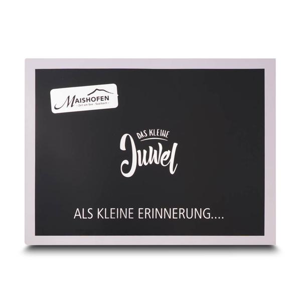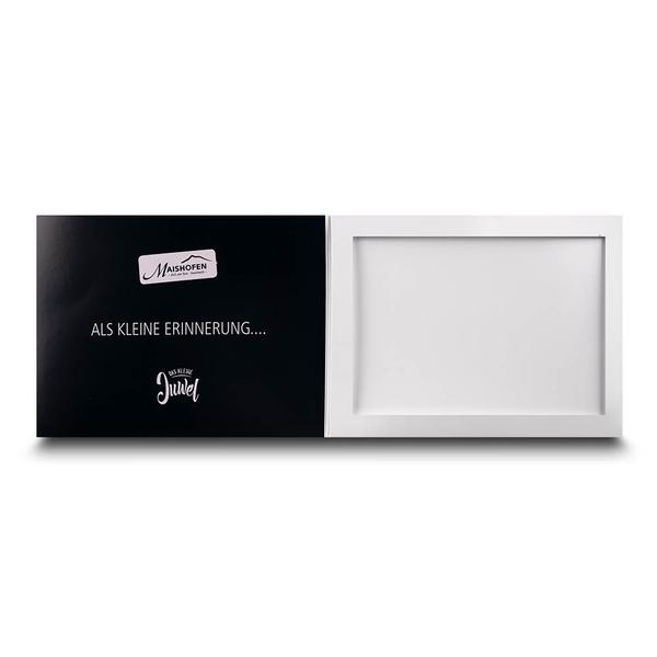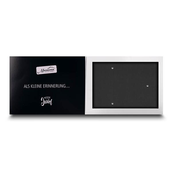 Die Passepartout Mappe Quer Maishofen ist ein exklusives und hochwertiges Produkt für Tourismusregionen wie Maishofen. Die Mappe dient als elegantes Erinnerungsstück, dessen Vorderseite mit dem Titel "das kleine Juwel" und einer glänzenden Heißfolienprägung in Silber veredelt ist. Innen ist die Mappe so konzipiert, dass ein Foto im Passepartout-Ausschnitt von 275 x 190 mm elegant präsentiert werden kann. Diese hochwertige Mappe hilft Maishofen, die Markenbotschaft professionell und emotional zu kommunizieren. Ihre durchdachte Funktionalität und das ansprechende Design spiegeln den Qualitätsanspruch und die Seriosität der Region wider. Sie ermöglicht eine ansprechende Übergabe von Erinnerungsfotos an Gäste und stärkt so die Kundenbindung im Tourismusbereich.