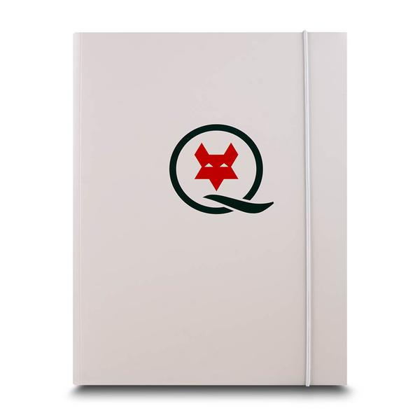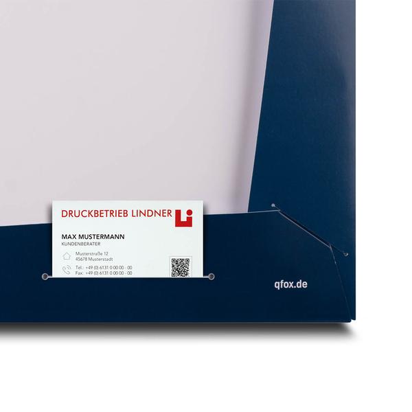 Die Q-FOX Sales Foldermappe ist eine hochwertige Spitzlaschen-Mappe aus stabilem 360 g White Design Papier. Veredelt mit mattem Brillantlack und partiellem UV-Glanzlack auf dem Logo entsteht ein edler Kontrast, der die Marke gezielt hervorhebt. Mit einer Steghöhe von 8 mm bietet die Mappe ausreichend Platz für umfangreiche Unterlagen. Ein weißer Gummizugverschluss sorgt dafür, dass alle Inhalte sicher zusammengehalten werden. Im Inneren überzeugt die Mappe durch eine durchdachte Aufteilung: Auf der rechten Seite befinden sich zwei gesteckte, dunkelblaue Laschen mit integriertem Visitenkartenschlitz, die Unterlagen ordentlich fixieren und eine übersichtliche Präsentation ermöglichen. Die Mappe eignet sich ideal für Beratungsgespräche, Präsentationen und den professionellen Einsatz in der IT-Branche. Sie unterstützt Q-FOX dabei, digitale Lösungen und IT-Leistungen hochwertig zu präsentieren und einen überzeugenden ersten Eindruck zu hinterlassen. Die sorgfältige Verarbeitung, funktionale Details wie der integrierte Visitenkartenschlitz und die gezielte Veredelung unterstreichen den modernen, innovativen Markenauftritt und machen die Mappe zu einem wirkungsvollen Verkaufs- und Präsentationsmittel.