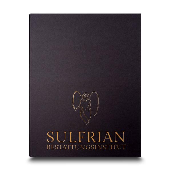Die Sammelmappe Bestattungsinstitut ist eine exklusive Drucksache, die durch eine edle Heißfolienprägung in Gold und eine hochwertige Haptik überzeugt. Das Design besticht durch den goldenen Schriftzug und das Engel-Motiv auf der Vorderseite, während ein praktischer Klettverschluss und drei variable Innenlaschen für eine sichere Aufbewahrung sensibler Dokumente sorgen. Wir vom Mappenhaus unterstützen Sulfrian Bestattungen dabei, ihre würdevolle Begleitung und Kompetenz in der Bestatterbranche haptisch und optisch perfekt zu untermauern. Mit dieser Mappe erreicht das Bestattungsinstitut das Ziel, Marken-Botschaften hochwertig zu präsentieren und Hinterbliebenen in schweren Stunden Halt durch eine strukturierte Unterlagenübergabe zu geben. Der integrierte Visitenkartenschlitz auf der unteren Lasche ermöglicht zudem eine diskrete und professionelle Kontaktpflege. Als Hersteller helfen wir Sulfrian dabei, ihren pietätvollen Markenkern durch exzellente Veredelungen wie die Goldprägung spürbar zu machen und einen bleibenden, seriösen Eindruck zu hinterlassen.