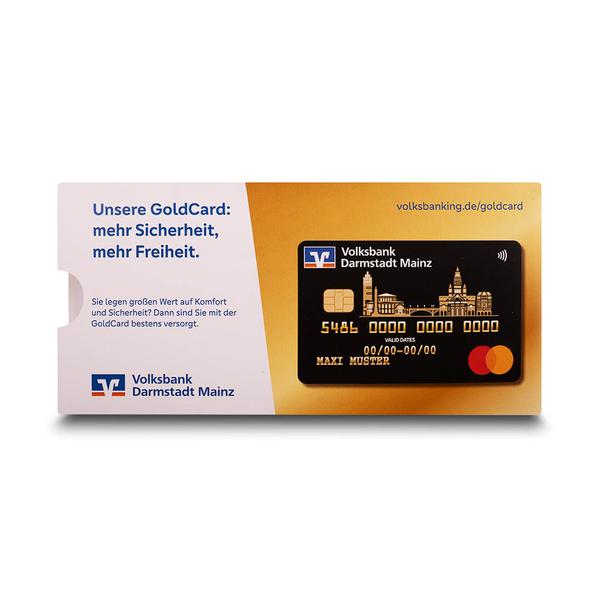 Die Schiebekarte GoldCard Volksbank ist ein kreatives und interaktives Produkt für Finanzdienstleister wie die Volksbank. Mit dieser Karte, die als Werbeflyer dient, wird der Mehrwert der Mastercard Gold bei Reisen veranschaulicht. Durch einen Schieber kann man die Ersparnis je nach Reisevolumen herausziehen. Die Hülle ist mit einem Volksbank-Logo und -Design bedruckt, was das Markenimage unterstreicht. Ein Griffloch sorgt für ein einfaches Herausziehen der Karte. Diese hochwertige Schiebekarte hilft der Volksbank Darmstadt Mainz, ihre Markenbotschaft professionell und kompetent zu kommunizieren. Ihre durchdachte Funktionalität und das ansprechende Design spiegeln den Qualitätsanspruch und die Seriosität der Bank wider. Sie ermöglicht eine effiziente und repräsentative Übergabe von Informationen an Kunden und Partner und stärkt so die Kundenbindung im Finanzbereich.
