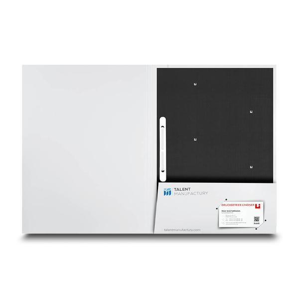 Die Schnellhefter Mappe Talent Consulting wird aus 360g White Design Karton gefertigt und einseitig matt lackiert, wodurch sie eine klare, hochwertige Anmutung erhält. Außen und innen bewusst weiß gehalten, trägt die Titelseite oben links das Logo, während die rechte Innentasche mit Logo und QR-Code bedruckt ist. Eine eingeklebte Schnellheftermechanik sowie eine großzügige Tasche mit Froschsteg bieten sicheren Halt für umfangreiche Unterlagen, ergänzt durch einen quer angelegten Visitenkartenschlitz. So entsteht eine strukturierte und funktionale Präsentationslösung. Talent Manufactury nutzt diese Mappe im Bereich Talent Consulting und Personalentwicklung, um Konzepte, Analysen und Beratungsunterlagen professionell zu überreichen. In der Beratungsbranche zählt ein klarer, durchdachter Auftritt, der Kompetenz und Struktur vermittelt. Als Hersteller unterstützen wir dabei, diese Markenbotschaft hochwertig umzusetzen und Beratungsleistungen wirkungsvoll zu präsentieren.
