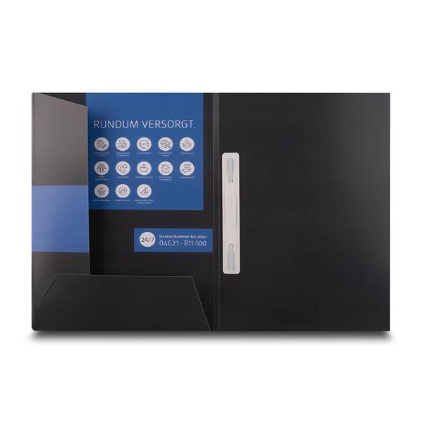 Die Spar-Mappe Baugenossenschaft übergibt Vertrags- und Sparunterlagen ordentlich gebündelt und vermittelt sofort Übersicht und Sicherheit. Gefertigt aus 300g White Design Karton mit beidseitigem Li-Brillantlack und individueller Bedruckung bleibt sie langlebig und hochwertig in der Handhabung. Ein Mittelsteg, Einstecklaschen und eine innenliegende Abheftvorrichtung halten Dokumente dauerhaft strukturiert zusammen. Als Hersteller unterstützen wir die Baugenossenschaft dabei, Finanz- und Mitgliedschaftsangebote klar zu erklären und Vertrauen bereits beim Überreichen der Unterlagen aufzubauen.