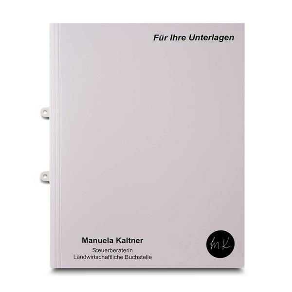 Die Schnellheftermappe für Steuerberater dient als praktische und professionelle Sammlung wichtiger Mandantenunterlagen. Diese Mappe verfügt über eine spezielle Schnellhefter-Mechanik mit einer sowohl innen- als auch außenseitigen Abheftung, die auf einem beweglichen Steg angebracht ist. So lassen sich Dokumente schnell und sicher abheften und bei Bedarf flexibel in Ordnern oder anderen Ablagesystemen verstauen. Steuerberaterin Kaltner, spezialisiert auf landwirtschaftliche Buchführung, nutzt diese Mappe, um die Unterlagen ihrer Mandanten geordnet und übersichtlich zu führen. Wir als Ihre Druckerei unterstützen Steuerberater dabei, ihre Arbeitsabläufe durch funktionale und professionell gestaltete Druckprodukte zu optimieren. Diese Mappe trägt zur effizienten Organisation und zum professionellen Auftreten bei.