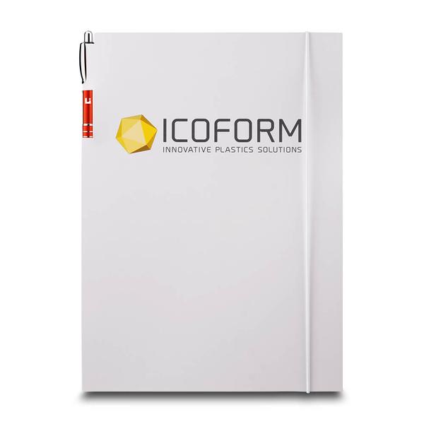 Die Taschen-Mappe "Plastics" für Icoform bietet eine professionelle und funktionale Lösung zur Präsentation umfangreicher Unterlagen. Bedruckt mit Logo und Schriftzug, vermittelt die Mappe einen klaren Unternehmensauftritt. Sie ist ausgestattet mit einem praktischen, gestanzten Stifthalter und einem weißen Gummizug, der alle Inhalte sicher zusammenhält. Links in der Mappe befindet sich eine Tasche mit hoher Füllhöhe und einer Visitenkartenstanzung, ideal für lose Dokumente und Kontaktdaten. Rechts im Bund sorgt eine Innenabheftung für die geordnete Ablage weiterer wichtiger Papiere. Icoform, ein Teil von Isosport und spezialisiert auf Hochleistungs-Verbundwerkstoffe und Kunststoffe, nutzt diese Mappe, um seine Produkte und technischen Lösungen übersichtlich und gebündelt zu präsentieren. Wir als Ihre Druckerei sind stolz darauf, Unternehmen im Bereich der Kunststoff- und Verbundwerkstoffindustrie dabei zu unterstützen, ihre Expertise durch hochwertige und funktionale Druckprodukte zu kommunizieren.