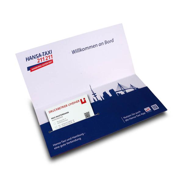 Herzlich willkommen an Bord! Die Tickethülle von Hansa-Taxi bietet Fahrgästen einen stilvollen Empfang. Diese schmale Mappe dient als elegante Hülle für Fahrscheine und andere Dokumente und verfügt über eine praktische Tasche mit einem Visitenkartenschlitz. So werden Fahrgäste nicht nur befördert, sondern auch persönlich begrüßt. Hansa-Taxi, bekannt für seinen zuverlässigen und komfortablen Service, setzt auf diese Hülle, um seinen Kunden einen Mehrwert zu bieten.