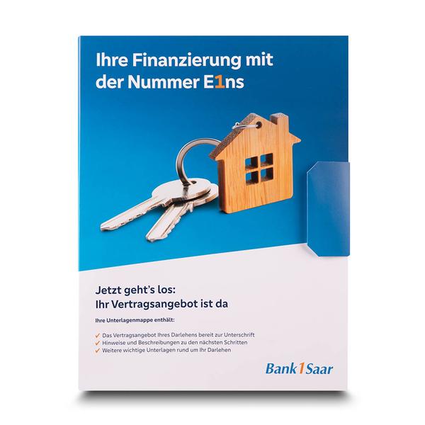 Die Unterlagenmappe Finanzierung ist ein professionelles und vielseitiges Produkt für Banken wie die Bank 1 Saar. Diese Fächermappe ist als Vertragsangebot konzipiert. Die Innenausstattung ist besonders funktional: Ein 3-fach Register aus 250g White Design Papier mit Deckblatt ist eingeheftet. Zwei Laschen pro Fach, zwei Visitenkartenschlitze und eine Top-Allround-Abheftung ermöglichen eine geordnete Präsentation. Diese hochwertige Mappe hilft der Bank 1 Saar, bei Kunden einen bleibenden und kompetenten Eindruck zu hinterlassen. Ihre durchdachte Funktionalität und das ansprechende Design spiegeln den Qualitätsanspruch und die Seriosität der Bank wider. Sie ermöglicht eine effiziente und repräsentative Übergabe von Informationen an Kunden und Partner und stärkt so die Kundenbindung im Finanzbereich.