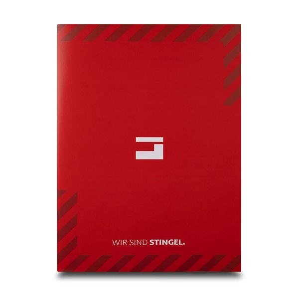 Die Urkundenmappe Pantone überzeugt durch stabile Verarbeitung aus Qualitäts-Mappenkarton und eine klare, kraftvolle Farbgestaltung. Gedruckt auf 360 g White Design, beidseitig mit mattem Brillantlack veredelt und mit einer Tiefprägung bis 50 cm² versehen, entsteht eine hochwertige Haptik mit sichtbarer Wertigkeit. Die Titelseite zeigt Logo und den Schriftzug „wir sind stingel“ auf rotem Hintergrund, auch die Innenseiten sind konsequent in Rot gehalten. Ein Mittelsteg sowie zwei gesteckte Lasche sorgen für sicheren Halt der Urkunde und eine saubere Präsentation. Stingel nutzt diese Mappe, um Auszeichnungen und Zertifikate im professionellen Umfeld wirkungsvoll zu überreichen und die eigene Markenidentität klar zu unterstreichen. Als Hersteller begleiten wir Stingel dabei, Inhalte und Werte in einem starken Markenauftritt präzise und hochwertig sichtbar zu machen.