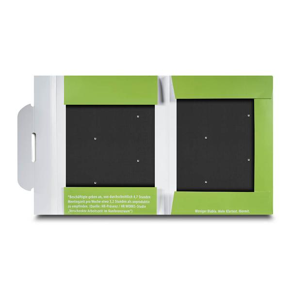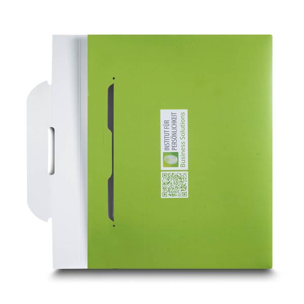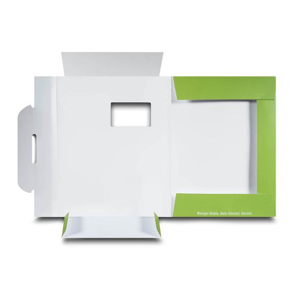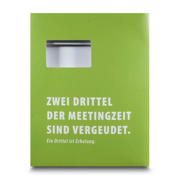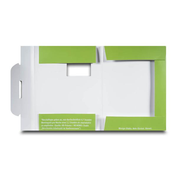 Die Versandmappe Institut für Persönlichkeit ist eine großformatige Mailmappe aus stabilem 360 g White Pack mit einseitigem mattem Brillantlack und robuster Verarbeitung. Auf der hellgrünen Titelseite steht in weißer Großschrift die prägnante Botschaft „zwei Drittel der Meetingzeit sind vergeudet. Ein Drittel ist Erholung“ und weckt sofort Aufmerksamkeit. Eine integrierte Fensterstanze, ein sicherer Mailverschluss sowie vier innenliegende grüne Laschen mit 12 mm Steghöhe halten die Inhalte zuverlässig an Ort und Stelle. So verbindet die Mappe Schutz, Struktur und eine klare kommunikative Aussage. Das Institut für Persönlichkeit – B&A GmbH nutzt diese Versandmappe im Trainings- und Beratungsumfeld, um Seminarunterlagen, Konzepte und Impulse professionell zu versenden. Als Hersteller unterstützen wir dabei, Inhalte und Haltung in einem starken Markenauftritt hochwertig und wirkungsvoll zu präsentieren.