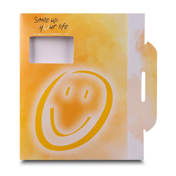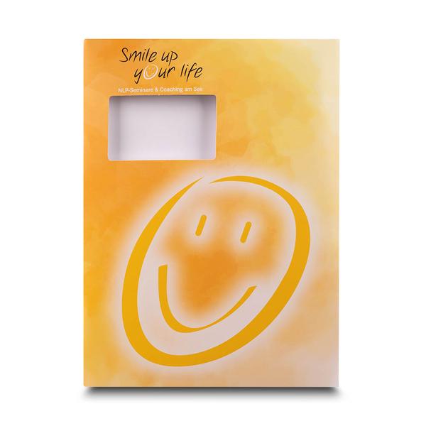 Die Versandmappe NLP Seminare ist eine funktionale Mailmappe, die speziell für den sicheren und aufmerksamkeitsstarken Versand von Seminarunterlagen entwickelt wurde. Ein stabiler Mailverschluss, eine markante Fensterstanze sowie die einseitige Veredelung mit Li-Brillantlack matt sorgen für Schutz, Wertigkeit und eine angenehme Haptik bereits beim Öffnen. Im Inneren halten insgesamt sechs flache Laschen die Inhalte zuverlässig an Ort und Stelle, ergänzt durch einen integrierten Visitenkartenschlitz für den persönlichen Kontakt. Wir vom Mappenhaus unterstützen Smile up your life dabei, ihre Coaching- und NLP-Angebote in der Weiterbildungsbranche professionell und positiv zu präsentieren. Die Mappe erzeugt schon beim Posteingang ein sympathisches Markenerlebnis, transportiert Marken-Botschaften hochwertig und stärkt den Markenkern von Freude, Motivation und persönlicher Entwicklung.