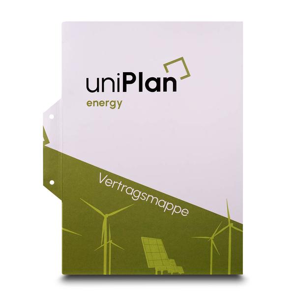 Die Vertragsmappe Energy ist ein exklusives und funktionales Produkt für Unternehmen wie die uniPlan Gruppe. Das moderne, technische Layout mit stilisierten Windrädern und Solarpanelen ist perfekt auf das Thema erneuerbare Energien abgestimmt. Die Mappe besticht durch eine Hochprägung des Logos und einen sichtbaren Magnetverschluss. Sie verfügt über eine große geklebte Tasche rechts mit Visitenkartenschlitz und eine Top-Allround-Abheftung, was eine geordnete Präsentation von Dokumenten ermöglicht. Diese hochwertige Mappe hilft der uniPlan Gruppe, einen professionellen und kompetenten Eindruck bei Kunden zu hinterlassen. Ihre durchdachte Funktionalität und das ansprechende Design spiegeln den Qualitätsanspruch und die Seriosität des Unternehmens wider. Sie ermöglicht eine effiziente und repräsentative Übergabe von Vertragsunterlagen und stärkt so die Kundenbindung im Energiesektor.