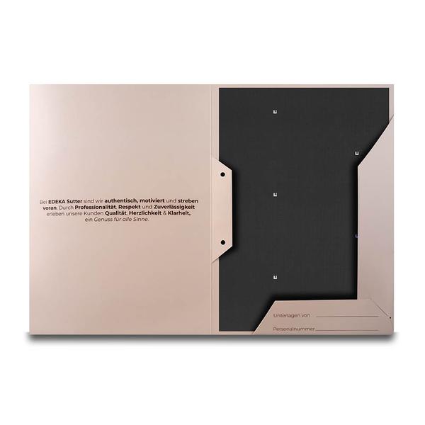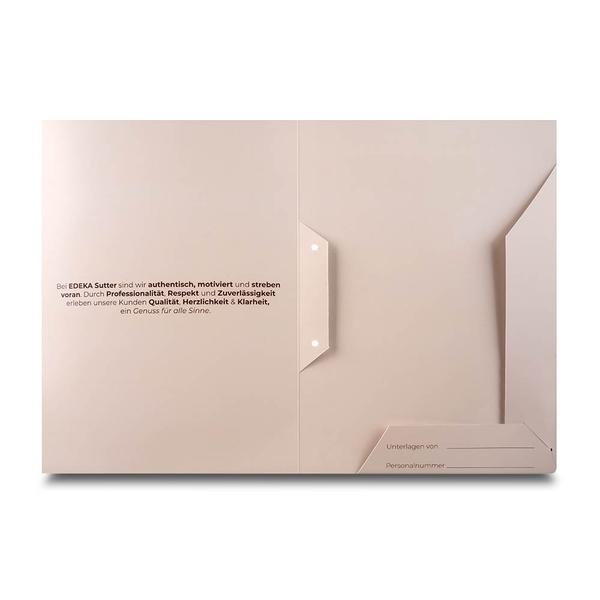 Die Willkommensmappe EDEKA Sutter ist eine hochwertige Willkommensmappe aus stabilem 300g White Design Karton mit beidseitigem Li-Brillantlack und trägt außen Logo, den Namen „Sutter“ sowie den Slogan „genuss für alle sinne“. Innen sichern zwei gesteckte Laschen auf der rechten Seite alle Unterlagen, während auf der unteren Lasche zwei Felder zum ausfüllen platziert sind. Links ist ein kurzer Vorstellungstext abgebildet. Die warme beige Gestaltung sorgt für einen persönlichen ersten Eindruck und führt neue Mitarbeitende strukturiert durch wichtige Informationen. Als Hersteller helfen wir EDEKA Sutter, Schulungs- und Unternehmensunterlagen geordnet zu überreichen und den Einstieg in den Arbeitsalltag klar und freundlich zu begleiten.