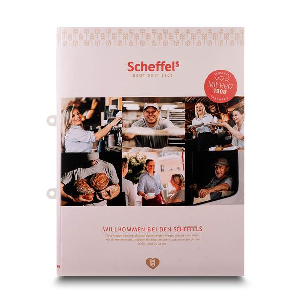 Die Mappe ist ein professionelles und einladendes Produkt für Bäckereien wie Scheffels. Das ansprechende Layout zeigt eine Collage von Bäckern und Backwaren, was die Handwerkskunst und den Genuss unterstreicht. Die Mappe dient als Willkommensmappe und verfügt über zwei gesteckte Laschen auf der linken Seite mit einem diagonalen Visitenkartenschlitz. Eine Abheftvorrichtung, die sich auch zum Rausschieben eignet, sorgt für eine geordnete Ablage von Dokumenten. Diese hochwertige Mappe hilft Scheffels Backen, ihre Markenbotschaft professionell und kompetent zu kommunizieren. Ihre durchdachte Funktionalität und das ansprechende Design spiegeln den Qualitätsanspruch und die Seriosität des Unternehmens wider. Sie ermöglicht eine effiziente und repräsentative Übergabe von Informationen an Mitarbeiter und Partner und stärkt so die Kundenbindung im Lebensmittelhandwerk.