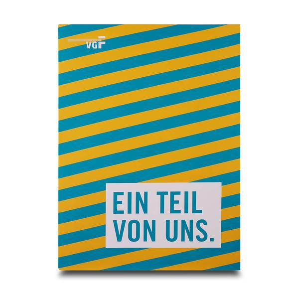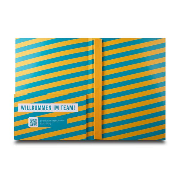 Die Willkommensmappe Stadtwerke besticht durch ihren hochwertigen 360 g White Design Mappenkarton, der beidseitig mit einem edlen, matten Brillantlack veredelt ist. Auf der Titelseite präsentiert sich das Logo zusammen mit dem prägnanten Schriftzug „ein teil von uns“ auf einem markanten blau-gelb gestreiften Hintergrund, wobei dieses Design im Innenteil sowie auf den Taschen konsequent fortgeführt wird. Die funktionale Ausstattung umfasst einen 12 mm Mittelsteg, eine geräumige linke Tasche mit Doppel-Nut-Steg, sowie eine gelbe Li4doit-Magnetklemme, die bis zu 20 Blatt sicher und repräsentativ fixiert. Ein besonderes Highlight ist der Aufdruck „willkommen im team“ auf der Innentasche, der durch einen integrierten QR-Code die direkte Verbindung zu weiteren Informationen schafft. Unternehmen wie die Stadtwerke Verkehrsgesellschaft Frankfurt am Main mbH setzen diese Mappe gezielt ein, um neue Mitarbeitende im Verkehrs- und Versorgungsbereich strukturiert zu begrüßen und von der ersten Minute an ein echtes Gefühl der Zugehörigkeit zu schaffen. Wir begleiten Sie dabei, Ihre Unternehmenswerte, Ihren Teamgeist und Ihre Kompetenz durch einen starken Markenauftritt hochwertig sichtbar zu machen.